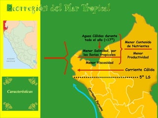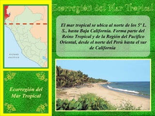 El documento describe las características del mar tropical ubicado al norte de los 5o de latitud sur hasta Baja California. El mar tropical forma parte de la región del Pacífico Oriental y se caracteriza por aguas cálidas todo el año, menor salinidad, menor viscosidad y menor contenido de nutrientes. El documento también describe los manglares, zonas marinas ricas en fauna, que se encuentran en la desembocadura de los ríos Zarumilla y Tumbes en el norte de Perú. Los manglares están compuestos principalmente por el mangle rojo y