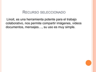 El documento presenta a María Alejandra Muñoz, profesora de Matemática y Ciencias Naturales en quinto y sexto grado en la Escuela Municipal República de Italia. Describe a Linoit como una herramienta para el trabajo colaborativo que permite compartir imágenes, videos y documentos de forma sencilla. Explica que se puede crear una cuenta en Linoit, luego un mural y compartir el enlace con estudiantes para que completen actividades colaborativas como publicar mensajes sobre el uso eficiente del agua.