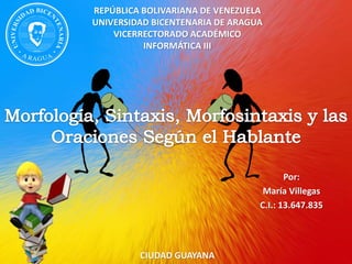 El documento resume conceptos clave de morfología, sintaxis y morfosintaxis. Explica que la morfología estudia la estructura interna de las palabras, mientras que la sintaxis describe cómo se combinan las palabras para formar oraciones. La morfosintaxis integra ambos análisis al estudiar la estructura morfológica y sintáctica de una oración. También describe los diferentes tipos de oraciones según el hablante: enunciativas, interrogativas, dubitativas, exhortativas y exclamativas.