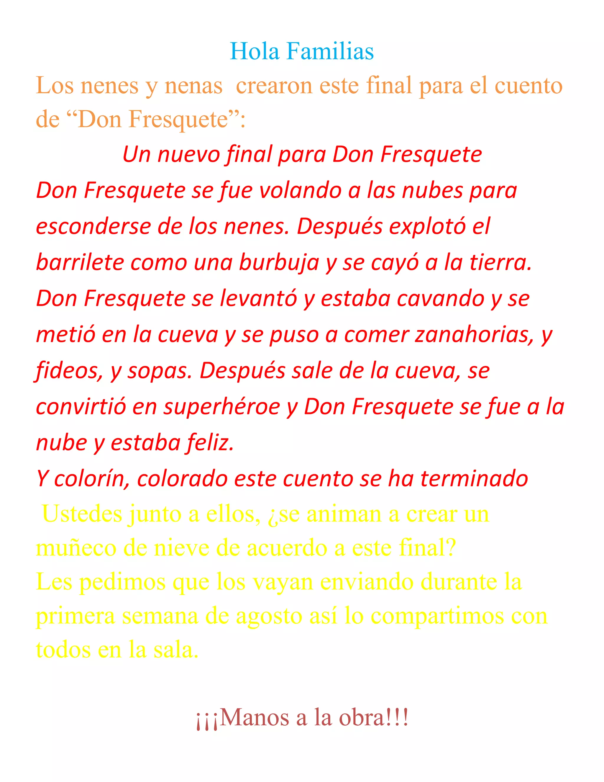 Los niños crearon un nuevo final para el cuento de "Don Fresquete" donde vuela entre las nubes para esconderse de los niños, su cometa explota y cae a la tierra, luego emerge de una cueva comiendo y se convierte en superhéroe. El documento invita a los padres a crear un muñeco de nieve basado en este final e incluye un enlace al cuento original narrado por María Elena Walsh.