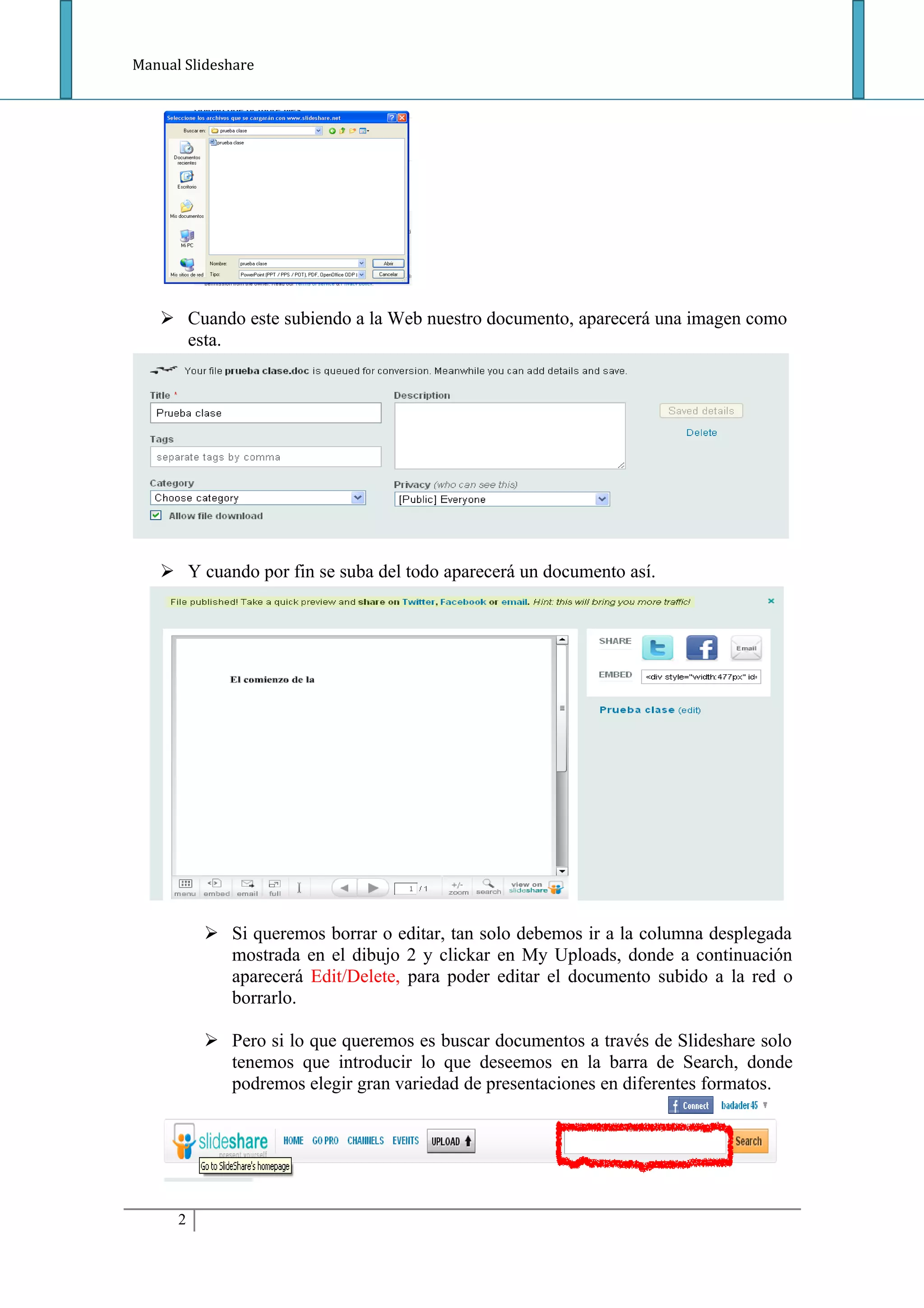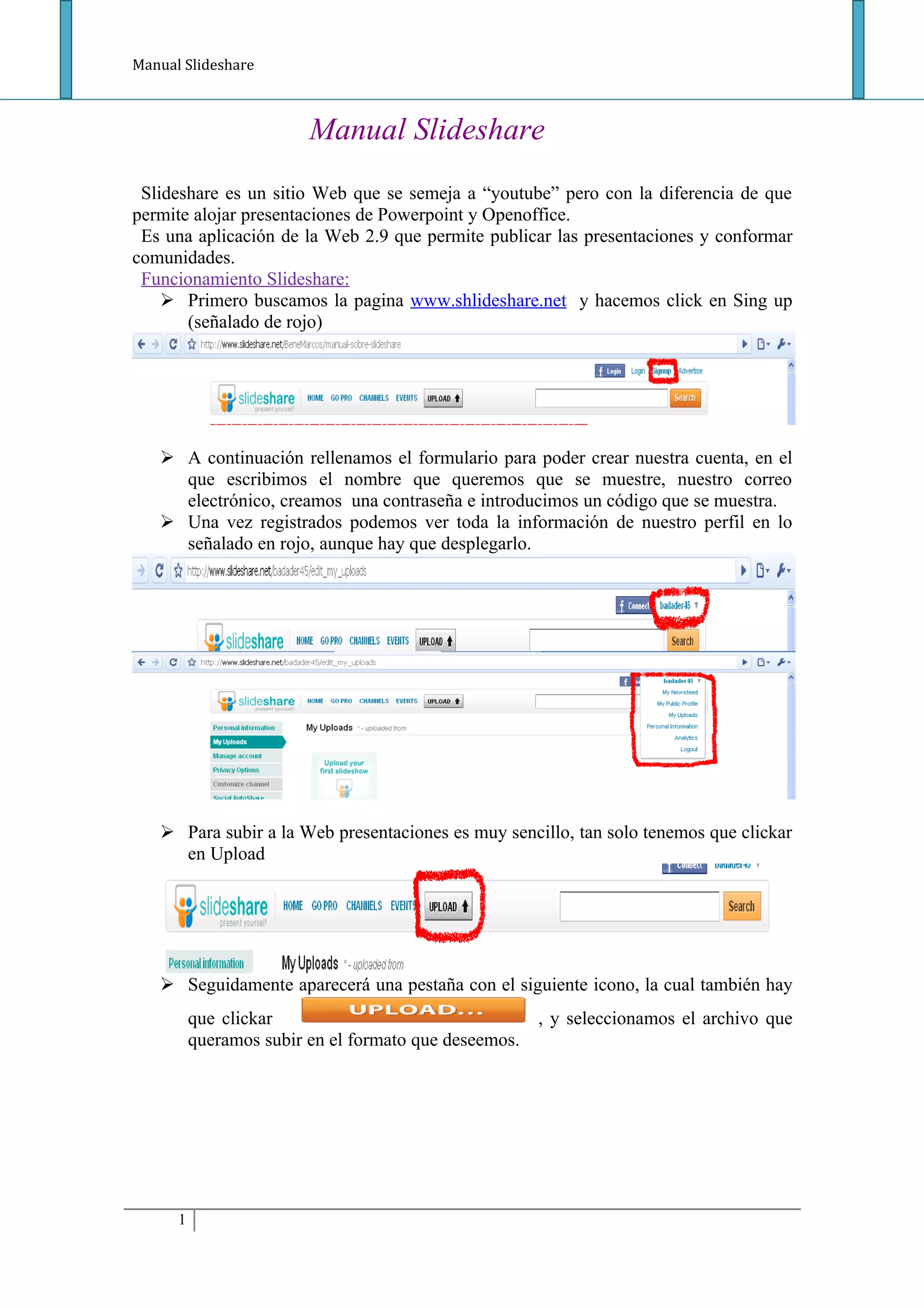 Este documento explica cómo funciona el sitio web Slideshare, el cual permite a los usuarios subir y compartir presentaciones de PowerPoint y OpenOffice. Los pasos incluyen crear una cuenta, subir presentaciones haciendo clic en el icono de carga, y luego poder editar o eliminar las presentaciones subidas accediendo a "Mis cargas". Los usuarios también pueden buscar presentaciones de otros usuarios a través de la barra de búsqueda.