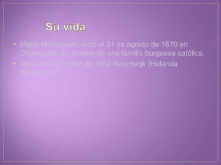 María Montessori fue una educadora italiana que desarrolló un método educativo basado en proveer un ambiente preparado para los niños que promueve su desarrollo natural. El método Montessori se caracteriza por agrupar edades en períodos de 3 años y dar a los niños libertad para explorar materiales didácticos que les ayudan a aprender. Montessori publicó varios libros sobre su método y filosofía educativa que enfatizan el potencial del niño y el papel del maestro en guiar su desarrollo.
