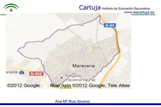 El documento presenta información sobre el Instituto de Educación Secundaria Cartuja en Maracena, incluyendo su nombre, dirección web y la localización en Maracena. Además, se muestran los nombres y apellidos de varios profesores del instituto.