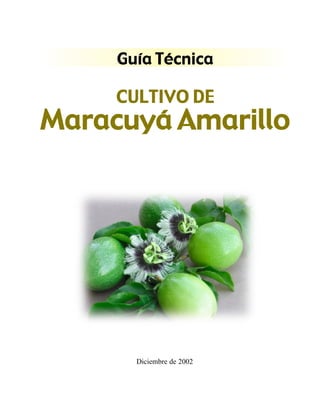 Este documento es una guía técnica del CENTA sobre el cultivo del maracuyá amarillo. Presenta información general sobre el maracuyá incluyendo su importancia, usos, zonas productoras, origen, clasificación, descripción botánica y variedades cultivadas. También describe el manejo agronómico del cultivo, control de plagas, cosecha, poscosecha, comercialización y procesamiento. Finalmente presenta los costos estimados de producción. El objetivo de la guía es servir como herramienta de consulta para product