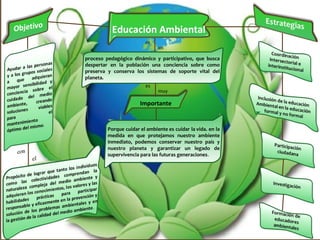 La educación ambiental es un proceso pedagógico dinámico y participativo que busca crear conciencia sobre la preservación y conservación de los sistemas de soporte vital del planeta. Es importante porque al proteger el ambiente local se protege el país y el planeta, garantizando la supervivencia de las generaciones futuras.