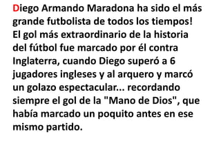 Diego Armando Maradona fue considerado el mejor futbolista de todos los tiempos, marcando goles extraordinarios con Argentina incluyendo la "Mano de Dios" contra Inglaterra en la Copa del Mundo de 1986, la cual ganó. Maradona también tuvo éxito con el Nápoles de Italia, ayudándolos a ganar su primer Scudetto y Copa UEFA. Nació en 1960 en Buenos Aires y usó su habilidad y destreza para llevar a Argentina y sus clubes al éxito.