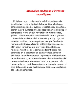 El siglo XX trajo grandes avances tecnológicos y científicos que transformaron la forma en que vivimos, como el desarrollo de la computadora, la radio, el teléfono celular y la Internet. Muchas invenciones tuvieron tanto beneficios como consecuencias negativas y fueron utilizadas para fines pacíficos y bélicos. En las últimas décadas, las tecnologías más importantes han sido la robótica, las baterías de iones de litio y los teléfonos celulares inteligentes, aunque existe el