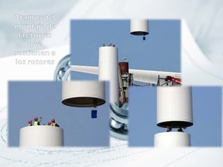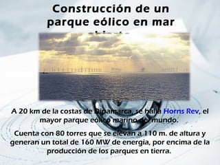 El documento describe un parque eólico marino ubicado a 20 km de la costa de Dinamarca llamado Horns Rev, el mayor del mundo, que cuenta con 80 torres de 110 metros de altura que generan un total de 160 MW de energía. Muestra fotografías de las paletas de las turbinas eólicas de 30 metros de largo con un diseño de ala de avión.