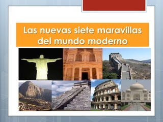 Este documento presenta las siete nuevas maravillas del mundo moderno: 1) Chichén Itzá en México, 2) el Coliseo de Roma en Italia, 3) la estatua Cristo Redentor en Brasil, 4) la Gran Muralla China, 5) Machu Picchu en Perú, 6) Petra en Jordania, y 7) el Taj Mahal en India. Cada sección brinda una breve descripción e historia de cada maravilla. El documento concluye con un mensaje sobre el derecho y deber de disfrutar y conservar estas mar
