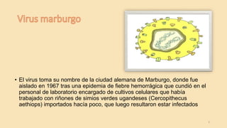 El virus de Marburgo fue aislado por primera vez en 1967 en Marburgo, Alemania tras una epidemia entre el personal de un laboratorio que había estado en contacto con riñones de simios infectados. El virus causa fiebre hemorrágica y presenta una estructura similar a otros filovirus, con una morfología irregular y un genoma de ARN de 19 kb que codifica 7 proteínas. Los síntomas incluyen necrosis en varios órganos como el hígado y la transmisión ocurre a través de fluidos corporales como la sangre, saliva