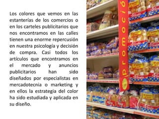 El documento describe cómo los colores usados en envases y publicidad afectan la psicología y las decisiones de compra de los consumidores. Explica las asociaciones comunes con diferentes colores como el rojo con la energía, el azul con la confianza, y el verde con lo natural, y cómo los diseñadores de envases usan estratégicamente los colores para influir en los consumidores.