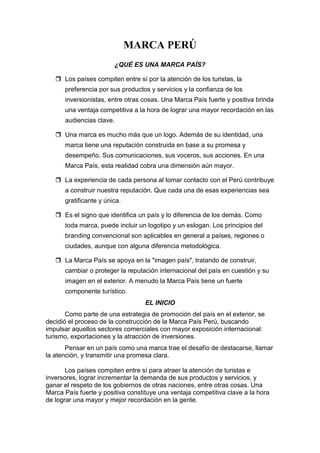 El documento presenta la Marca País Perú, diseñada para promover el turismo, las exportaciones y la inversión extranjera. Explica que una marca país busca posicionar la imagen y reputación de un país en el exterior de manera positiva para ganar competitividad. Luego describe el proceso de creación de la marca Perú y su lanzamiento oficial junto a embajadores peruanos reconocidos. Finalmente, detalla algunas actividades promocionales realizadas en el extranjero para dar a conocer la cultura y oferta de Perú.