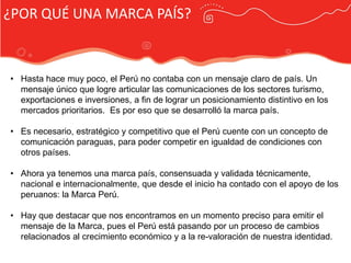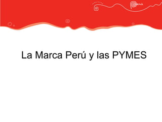 Este documento describe la Marca Perú y cómo puede ayudar a las pequeñas y medianas empresas (PYMES) peruanas. La Marca Perú ofrece licencias de uso a las PYMES para que puedan promover la imagen de Perú en sus comunicaciones, productos y eventos. Antes de otorgar una licencia, la Marca Perú evalúa que la empresa cumpla con sus obligaciones tributarias, tenga buena reputación y promueva valores peruanos. El objetivo es que las PYMES y la Marca Perú trabajen juntos para mejorar la competitividad de Per