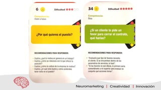 Este documento proporciona estrategias para desarrollar una marca personal fuerte, incluyendo compartir tu historia, dar sin esperar nada a cambio, descubrir tu posicionamiento único, cuidar tu lenguaje corporal y comunicación, fortalecer tu red, generar conexiones neurológicas con otros, ganarte enemigos estratégicamente, ser congruente, tomar control de tu marca, y prepararte para entrevistas laborales manejando diferentes tipos de preguntas. El objetivo final es convertirte en un imán del éxito a través