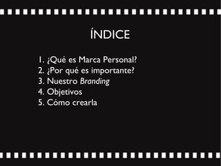 Este documento explica la importancia de la marca personal y cómo crearla. Define la marca personal como la huella que deja una persona en los demás. Explica que en un mercado laboral competitivo, una marca personal nos hace sobresalir. Detalla los pasos para crear una marca personal: definir quién eres a través de un ejercicio de autconocimiento, establecer un objetivo SMART, y darte a conocer a través de relaciones personales directas, presentaciones y redes sociales. El objetivo final es ser recordado y elegido por los dem