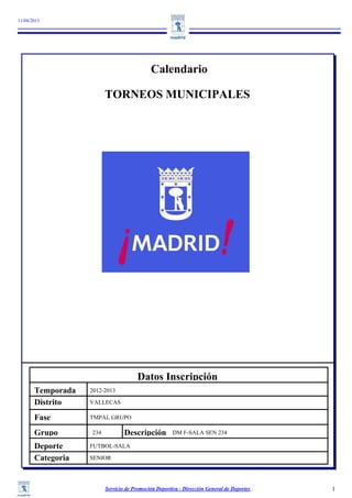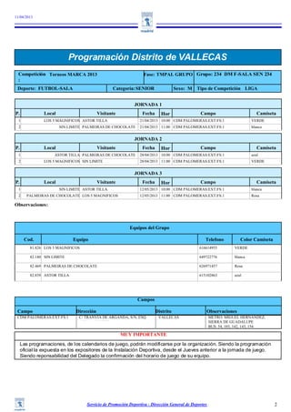 Este documento presenta el calendario de la temporada 2012-2013 para el torneo municipal de fútbol sala en el distrito de Vallecas en Madrid. Incluye los detalles de 3 equipos (Los 5 Magníficos, Sin Límite y Palmeiras de Chocolate) que compiten en el Grupo 234, con la programación de 3 jornadas que tendrán lugar entre el 21 de abril y el 12 de mayo en el campo de Palomeras.