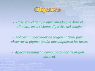 El documento describe un experimento para observar el tiempo de digestión en conejos usando remolacha como marcador natural. Se alimentó a un conejo con remolacha molida y concentrado para pigmentar sus heces. Al día siguiente, las heces aún estaban pigmentadas, lo que indica que la digestión del conejo toma aproximadamente 26 horas, más tiempo del reportado en la literatura de 24 horas.