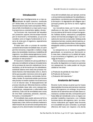 Este documento describe los marcadores de remodelado óseo y su utilidad en el diagnóstico y tratamiento de la osteoporosis. Explica que existen marcadores de formación ósea y resorción ósea que pueden usarse para predecir la pérdida de masa ósea, el riesgo de fracturas y evaluar la efectividad de los tratamientos. Además, brinda detalles sobre la anatomía del hueso y el proceso constante de remodelado ósea mediado por osteoblastos y osteoclastos. Los marcadores óseos