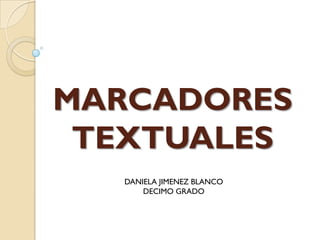 Este documento describe los marcadores textuales, que son unidades lingüísticas que ayudan a organizar y conectar las ideas en un texto para facilitar su interpretación. Explica que existen diferentes tipos de marcadores como organizadores, conectores, reformuladores y operadores, y proporciona ejemplos de cada tipo. También señala que los marcadores no pertenecen a una categoría gramatical específica y pueden ser preposiciones, conjunciones, adverbios o pronombres relativos.
