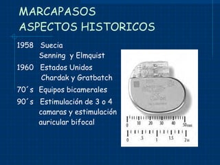 El documento proporciona información sobre la historia, componentes, tipos e indicaciones de los marcapasos. Brevemente describe: 1) La evolución de los marcapasos desde los años 50 con modelos unicamerales hasta los actuales tricamerales; 2) Los componentes principales de un marcapaso como el generador, electrodos y cables; 3) Diferentes tipos de marcapasos como unicamerales, bicamerales y su funcionamiento; 4) Principales indicaciones para la colocación de un marcapaso como bloqueos auriculoventriculares y disfunc