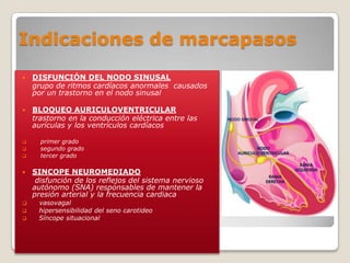 Este documento describe diferentes tipos de marcapasos e indicaciones para su uso en pacientes con diversas condiciones cardíacas, como disfunción del nodo sinusal, bloqueo auriculoventricular y síncopes neuromediados. Explica brevemente qué es un desfibrilador implantable y en qué pacientes existe un riesgo elevado de muerte súbita.