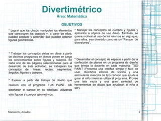 Este proyecto tiene como objetivo que los estudiantes aprendan conceptos geométricos como figuras, cuerpos y el espacio a través de la construcción de un parque de diversiones virtual y físico. Los estudiantes explorarán figuras geométricas, jugarán juegos que involucren estas figuras y crearán planos de los juegos del parque usando el programa Tux Paint en las computadoras. Luego construirán una maqueta física del parque usando estas figuras geométricas.