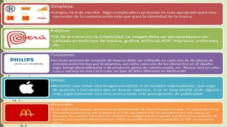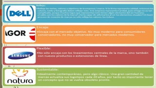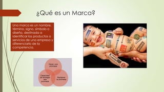 El documento define una marca como un nombre, término, signo, símbolo o diseño destinado a identificar los productos o servicios de una empresa y diferenciarlos de la competencia. Explica factores como la originalidad, el valor simbólico y la pregnancia que ayudan a una marca a ser memorable. También discute las ventajas y desventajas de marcas globales, marcas locales y marcas blancas.