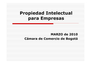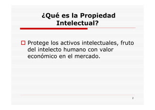 Este documento resume los conceptos clave de la propiedad intelectual para empresas. Explica que la propiedad intelectual protege los activos intangibles como ideas, estrategias y nuevas tecnologías. También describe las diferentes formas de protección como patentes, secretos empresariales, diseños industriales y marcas. Finalmente, explica cómo se regula la propiedad intelectual en Colombia de acuerdo con las normas de la Comunidad Andina.