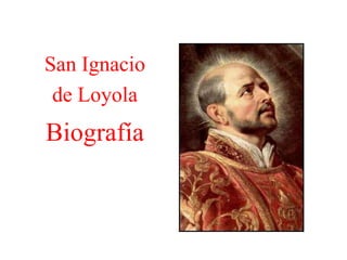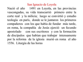 San Ignacio de Loyola nació en 1491 en España y originalmente sirvió como soldado antes de su conversión religiosa. Luego estudió teología y fundó la Compañía de Jesús en Roma en 1540. Ignacio escribió los Ejercicios Espirituales y guió a la Compañía de Jesús hasta su muerte en 1556, dedicándose a la reforma de la Iglesia y al apostolado.
