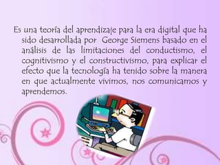 El conectivismo es una teoría del aprendizaje para la era digital desarrollada por George Siemens que se basa en la idea de que el conocimiento reside en redes de conexiones y que el aprendizaje ocurre a través de la conexión de nodos de información. Según esta teoría, el aprendizaje depende de la diversidad de opiniones, ocurre a través de conexiones entre personas, máquinas y redes, y requiere la actualización continua de información y la toma de decisiones sobre qué aprender.