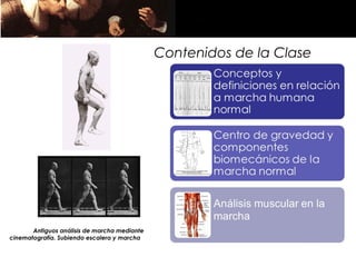 Este documento resume las bases morfológicas de la marcha y la bipedestación humana. Explica conceptos clave como el ciclo de marcha, fases de apoyo y avance, y variables de distancia. Describe el desplazamiento vertical y lateral del centro de gravedad durante la marcha, así como los componentes biomecánicos esqueléticos y musculares que permiten la marcha eficiente, como la rotación pélvica, flexión de rodillas y coordinación de rodillas y tobillos. Finalmente, analiza la acción muscular durante las diferentes f