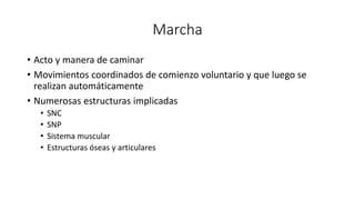 La marcha es un acto coordinado que involucra numerosas estructuras del sistema nervioso central, sistema nervioso periférico, sistema muscular y esqueleto. Es importante observar la marcha de un paciente para detectar alteraciones del sistema locomotor o nervioso. Existen diferentes tipos de marchas patológicas relacionadas con alteraciones osteomusculares o neurológicas, como la marcha antálgica, la marcha atáxica y la marcha espástica.