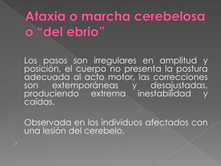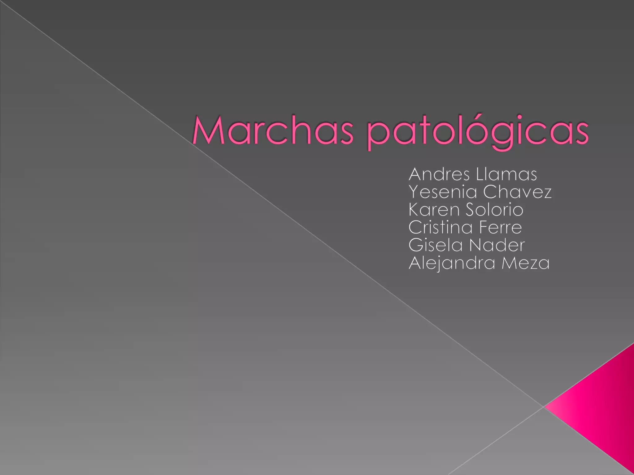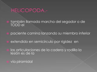 Este documento describe diferentes tipos de marchas patológicas, incluyendo las marchas parética, atáxica, parapléjica, hemiplegica, helicopoda, parkinsoniana, miopática y claudicante. Define las características de cada marcha y sus causas subyacentes, como síndromes cerebelosos, lesiones medulares, accidentes cerebrovasculares, enfermedad de Parkinson y distrofia muscular.