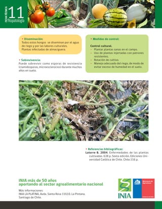 Este documento describe la marchitez en cucurbitáceas causada por hongos de suelo como Fusarium oxysporum f. sp. melonis, Fusarium solani f. sp. cucurbitae y Fusarium moniliforme. Los síntomas incluyen marchitez, amarillez y falta de desarrollo radicular en melón, sandía, pepino, zapallo e italiano. Los hongos pueden sobrevivir durante años en el suelo y diseminarse a través del agua de riego y labores culturales. Las medidas de control