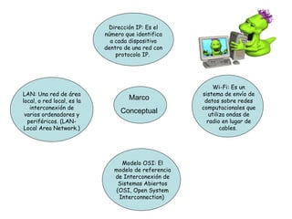 La dirección IP identifica dispositivos en una red, una LAN conecta ordenadores localmente, el modelo OSI establece protocolos de comunicación entre sistemas, y Wi-Fi transmite datos inalámbricamente usando ondas de radio.