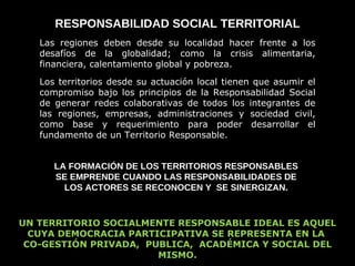 El documento presenta el marco conceptual del primer encuentro internacional de regiones socialmente responsables. Define una región socialmente responsable como aquella donde se representa la democracia participativa a través de la cogestión entre los sectores privado, público, académico y social. Explora conceptos como la responsabilidad social territorial, empresarial, universitaria y pública, así como la corresponsabilidad ciudadana, y propone como objetivo general promover las regiones socialmente responsables para lograr la equidad y los objetivos de desarrollo del milenio.