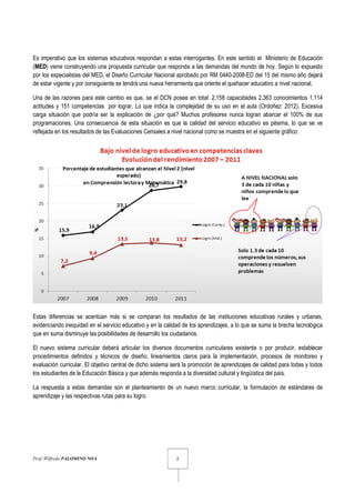 El documento presenta el marco curricular y las rutas de aprendizaje propuestas por el Ministerio de Educación del Perú. Explica que el mundo ha cambiado rápidamente y que el nuevo marco curricular debe enfocarse en 8 aprendizajes fundamentales para que los estudiantes puedan desenvolverse con éxito en la sociedad actual. Además, busca promover la calidad educativa mediante la rendición de cuentas de docentes, directores y el sistema en general sobre los logros de aprendizaje de los estudiantes.