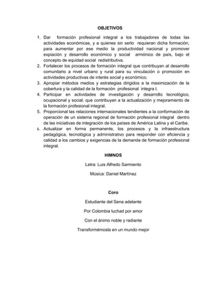 El documento presenta la misión, visión, objetivos y programas del Servicio Nacional de Aprendizaje (SENA) de Colombia. La misión es ofrecer formación profesional e integral para contribuir al desarrollo social, económico y tecnológico del país. La visión es que para el 2020 el SENA sea una entidad de clase mundial en formación profesional e innovación. Los objetivos incluyen dar formación profesional a trabajadores para aumentar la productividad y desarrollo del país. Los programas cubren áreas como gestión