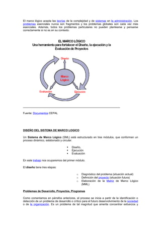 El documento describe el Marco Lógico (ML), una técnica para planificar, ejecutar y evaluar proyectos. El ML consiste en identificar un problema, definir objetivos para resolverlo, y desarrollar indicadores para medir el progreso. Se analizan las alternativas y se selecciona una estrategia, la cual se describe en una Matriz de Marco Lógico que vincula los objetivos, actividades, recursos e indicadores.