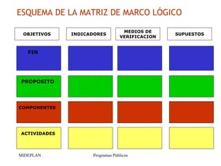 El documento describe los componentes clave de la matriz de marco lógico, incluidos los objetivos, indicadores, medios de verificación y supuestos. Explica que los indicadores son valores medibles que permiten evaluar el progreso hacia las metas planificadas. Los buenos indicadores deben ser pertinentes, comparables, independientes y generados de manera participativa.