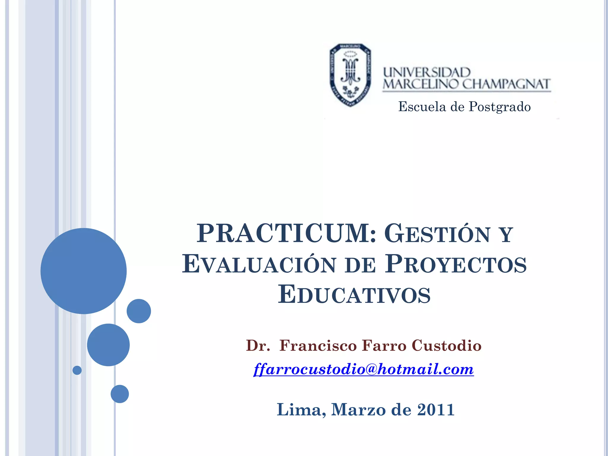 Este documento presenta información sobre la gestión y evaluación de proyectos educativos. Explica el proceso del marco lógico, el cual ofrece herramientas para la gerencia a lo largo del ciclo del proyecto. También describe el proceso de evaluación, incluyendo la definición de preguntas, recolección y análisis de datos, y la utilización de los resultados. Finalmente, presenta ejemplos de árboles de problemas y objetivos como herramientas para el diseño de proyectos.