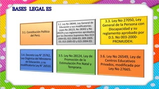 El documento trata sobre los esfuerzos nacionales para lograr que las escuelas sean espacios de aprendizaje inclusivos para todos los niños y jóvenes de una comunidad. Explica que existen bases legales que respaldan la inclusión educativa en el país y describe brevemente la evolución histórica hacia una educación más inclusiva desde la década de 1970 hasta la actualidad.