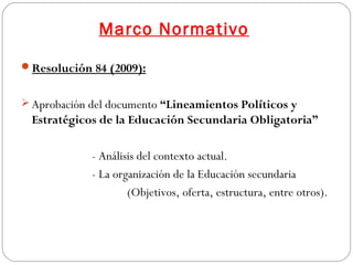 El documento aborda las resoluciones y lineamientos para la educación secundaria obligatoria en Argentina, enfatizando la importancia de la inclusión y el reconocimiento de los jóvenes como sujetos de derechos. Se proponen diversas estrategias y modalidades educativas que aseguran la calidad y terminabilidad de la educación, enfocándose en el uso de tecnologías de la información y comunicación (TIC) para facilitar el aprendizaje. También se destaca la necesidad de un compromiso institucional y comunitario para apoyar la diversidad de trayectorias educativas de los estudiantes.