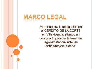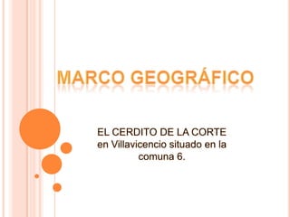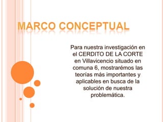 La investigación se centra en analizar la situación actual de la empresa de comida "El Cerdito de la Corte" en Villavicencio a través de la aplicación de diferentes teorías administrativas. Se describen conceptos clave como cerdo, cortes de carne de cerdo e higiene. Además, se resumen datos claves sobre el número de empleados, ventas, manejo contable, administración y otros aspectos operativos de la sucursal en Villavicencio.