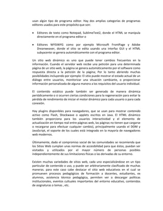El documento describe la importancia de los sitios web para difundir procesos pedagógicos en instituciones educativas. Explica qué es un sitio web, sus componentes y tipos de contenido. También describe herramientas como Adobe Dreamweaver y Adobe Flash que pueden usarse para diseñar e implementar sitios web educativos dinámicos e interactivos que promuevan la comunicación y formación en las comunidades.