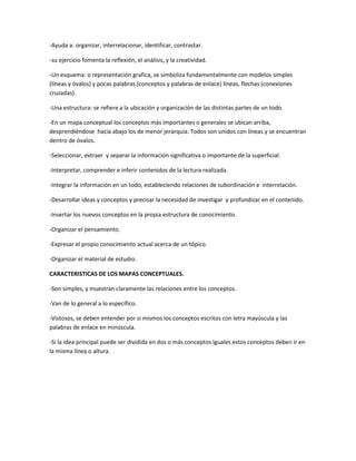 El documento describe cómo construir un marco teórico y explica el uso de mapas conceptuales. Explica que un marco teórico se basa en teorías que sustentan el trabajo y surgen de delimitar el problema de investigación. También debe explicitar el paradigma abordado y las teorías y antecedentes relevantes. Los mapas conceptuales ayudan a organizar y relacionar la información de manera gráfica mediante conceptos y palabras clave conectadas.