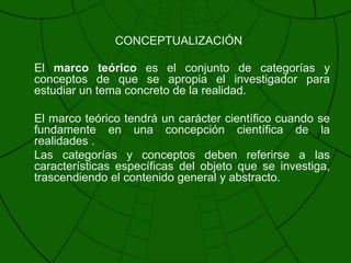 El documento explica el marco teórico como el conjunto de conceptos y categorías que el investigador utiliza para estudiar un tema. Define las funciones del marco teórico como orientar el estudio, prevenir errores, establecer hipótesis e interpretar resultados. También describe los componentes del marco teórico como el marco de referencia, marco teórico y marco conceptual, así como los pasos para elaborar el marco teórico que incluyen revisar literatura y adoptar una teoría.