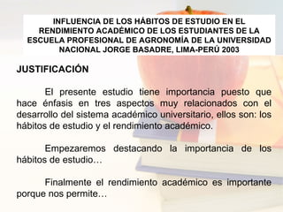 Este documento presenta el marco teórico de una investigación sobre la influencia de los hábitos de estudio en el rendimiento académico de los estudiantes de la Escuela Profesional de Agronomía de la Universidad Nacional Jorge Basadre. Revisa los antecedentes de estudios previos sobre las relaciones entre hábitos de estudio, rendimiento académico y otros factores. También expone las principales teorías sobre hábitos de estudio, adquisición de conocimientos, métodos de estudio y rendimiento académico que