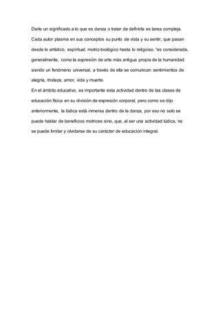 El documento trata sobre la danza como manifestación social. Define el folklore como la tradición popular constituida por el saber del pueblo. Explica que quien guíe clases de danza debe conocer el origen del folklore colombiano para transmitir los conocimientos de manera clara. También presenta conceptos sobre la relación entre sociedad y expresiones corporales lúdicas como la danza, la cual ha estado unida al hombre desde tiempos remotos como movimiento. Finalmente, señala que darle significado a la danza es complejo pues cada autor la define desde dist