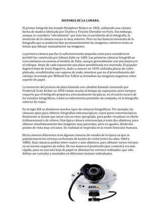 El documento describe la historia y el desarrollo de las cámaras fotográficas. Explica que las primeras cámaras digitales se basaron en sensores CCD desarrollados en los años 1970 y que la primera cámara digital registrada fue desarrollada por Kodak en 1975. También resume que las primeras cámaras análogas se remontan a la cámara oscura en el siglo XVII y que los principales avances en el siglo XIX incluyeron el daguerrotipo y el proceso de calotipo.